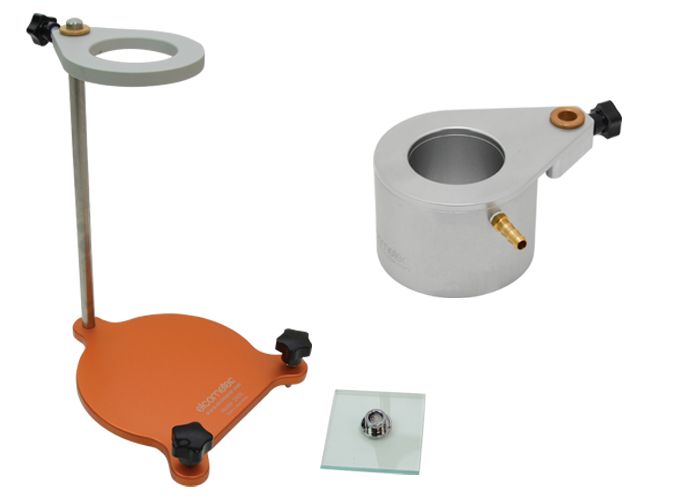 The cups can be supplied separately or with an adjustable stand which includes a precision level and an overflow glass draw plate. They can also be supplied with a flow jacket for temperature control (Thermo jacket).