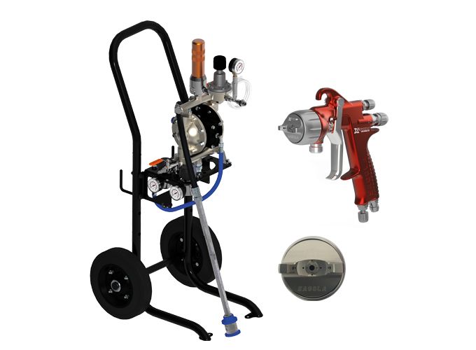 Pompa a spruzzo ad aria compressa a doppia membrana Elcometer Kara 1-30 con carrello e montaggio a parete fornita con pistola a spruzzo a pressione Sagola X4100, cappuccio aria XT01B - Kit ago e ugello da 1,20- Codice articolo : KA130-X41-XT01B12