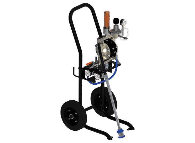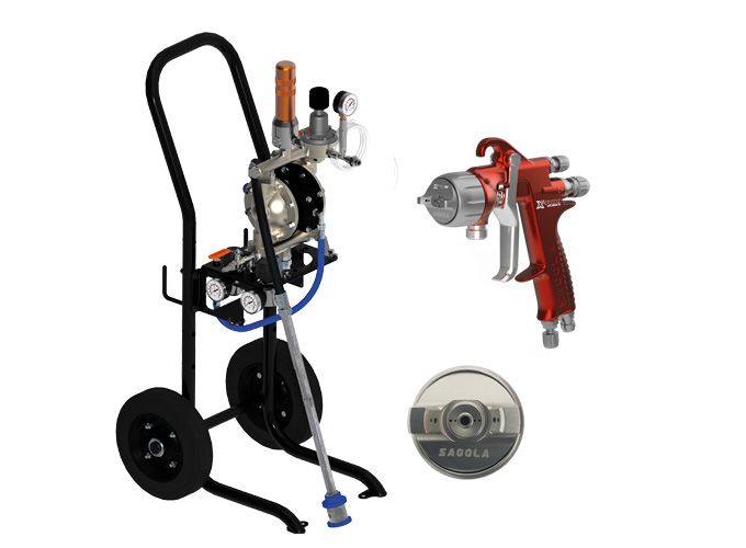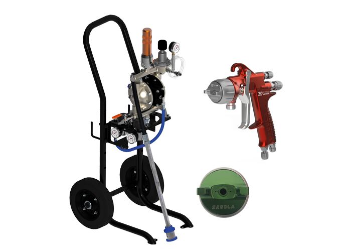 Pompa a spruzzo ad aria compressa a doppia membrana Elcometer Kara 1-40 con carrello e montaggio a parete fornita con pistola a spruzzo a pressione Sagola X4100, tappo aria 765 - kit ago e ugello 1,20- Codice articolo : KA140-X41-76512