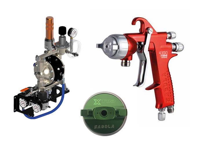 La linea di pompe Elcometer KARA è disponibile come pacchetto che comprende regolatore del fluido, filtro, sistema di regolazione dell'aria e kit di tubi flessibili, a cui si aggiunge una vasta gamma di pistole a spruzzo ad aria compressa Sagola.