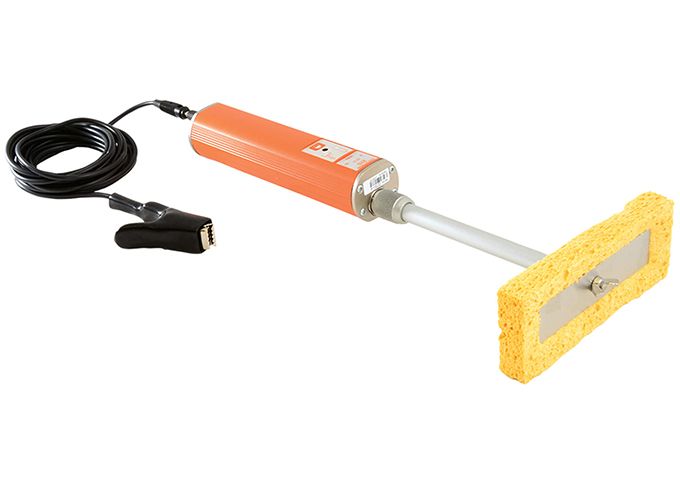 標準ホルダー (スポンジも含む)の長さ175mm(6.9インチ)重量 スポンジホルダー、ケーブル、電池を含み610g(21オンス) 内用品 ピンホール探知器、標準スポンジホルダーと平型スポンジ、わに口クリップ付きアース線4m(13フィート2インチ)、LR1600(AA)電池3本、取扱説明書 ● 校正証明書