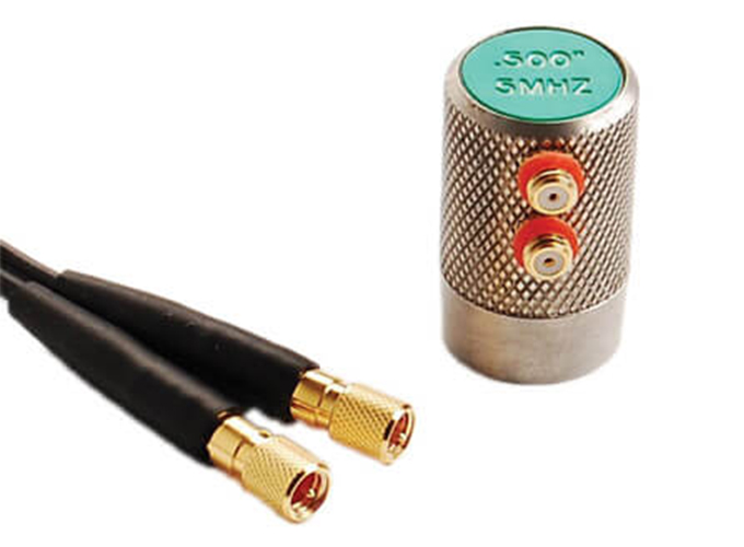 A dual element transducer consists of two crystal elements housed in the same case, separated by an acoustic barrier. Mostly for use with the thickness gauges.